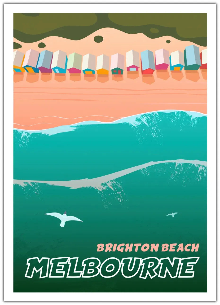 Melbourne Plakat fanger essensen af sol, strand og afslappet stemning. Motivet viser de ikoniske badehuse på Brighton Beach i smukke farver, der straks leder tankerne mod varme dage og havbrise. Et livligt og farverigt design, der bringer sommer og rejselyst ind i dit hjem.