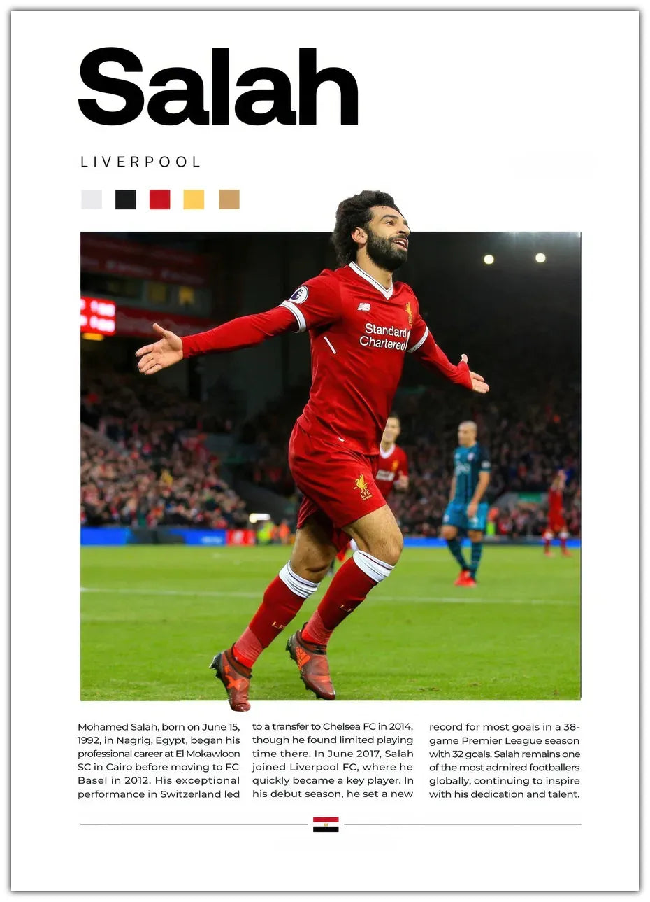 Mohamed Salah Plakat er mere end bare et billede – det er et symbol på dedikation, vilje og talent. En ideel gave til enhver fodboldelsker, eller til dig der vil tilføje et sporty og moderne udtryk til din indretning.