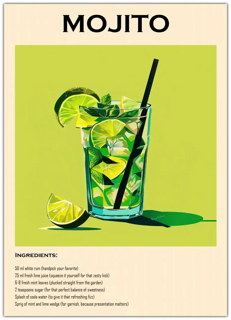 Fang den forfriskende smag af sommer med vores fortryllende Mojito-plakat. Tilføj et strejf af karibisk charme og livlig atmosfære til dit hjem eller bar med dette friske og sprudlende design. Lad dig inspirere til at blande den perfekte blanding af mynte og lime med vores smukke Mojito-plakat.