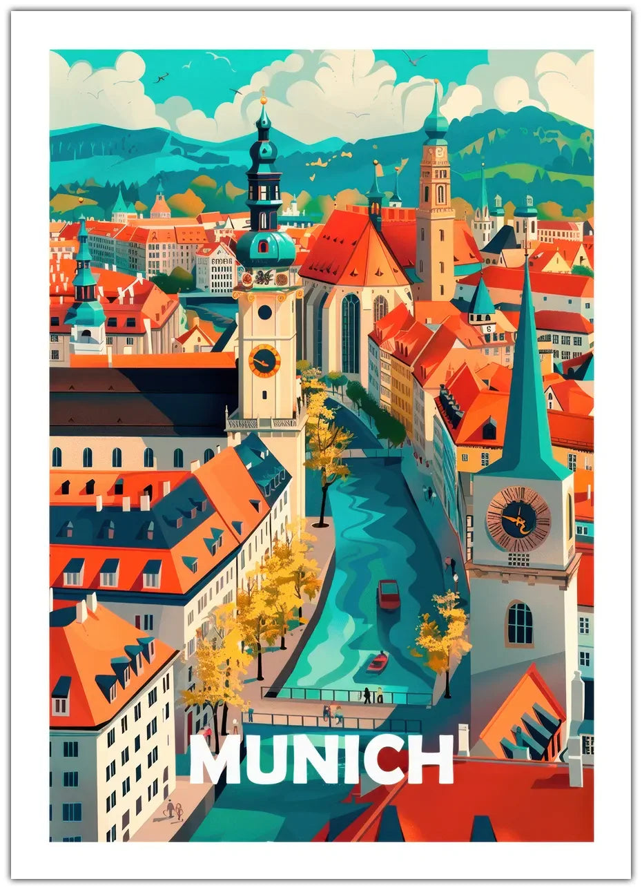 Oplev den bayerske charme og kulturelle rigdom med vores eksklusive Munich-plakat, der indfanger den unikke atmosfære i denne skønne tyske by. Med et varmt farveskema og en detaljeret gengivelse af Münchens ikoniske seværdigheder, hyggelige gader og traditionelle bayerske arkitektur inviterer denne plakat dig til at udforske alle facetter af denne fascinerende destination.