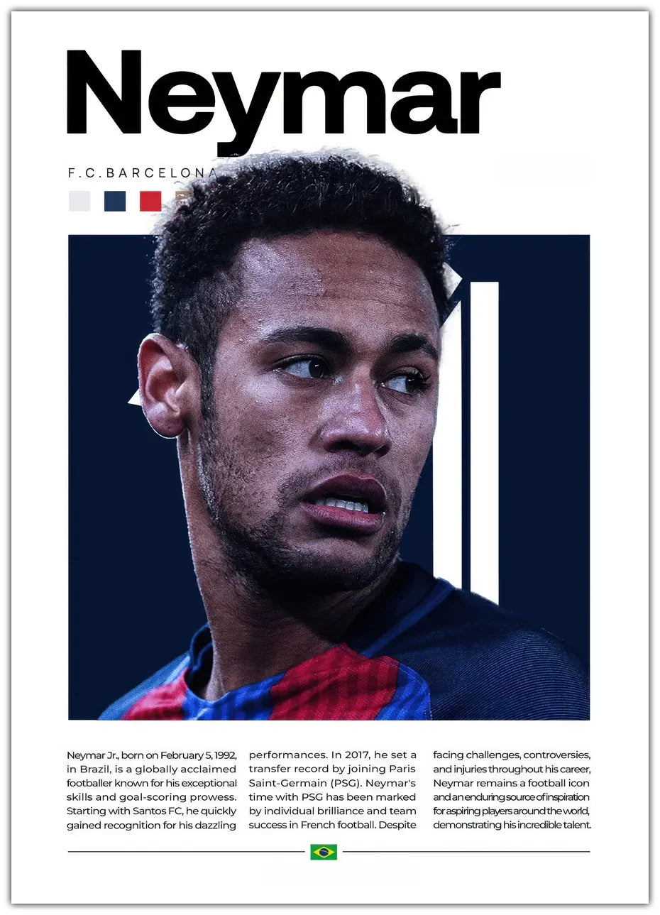 Klassisk plakat af Neymar i FC Barcelona-trøjen, der fanger hans magiske spil og driblinger. Perfekt til enhver fan og en flot vægdekoration!
