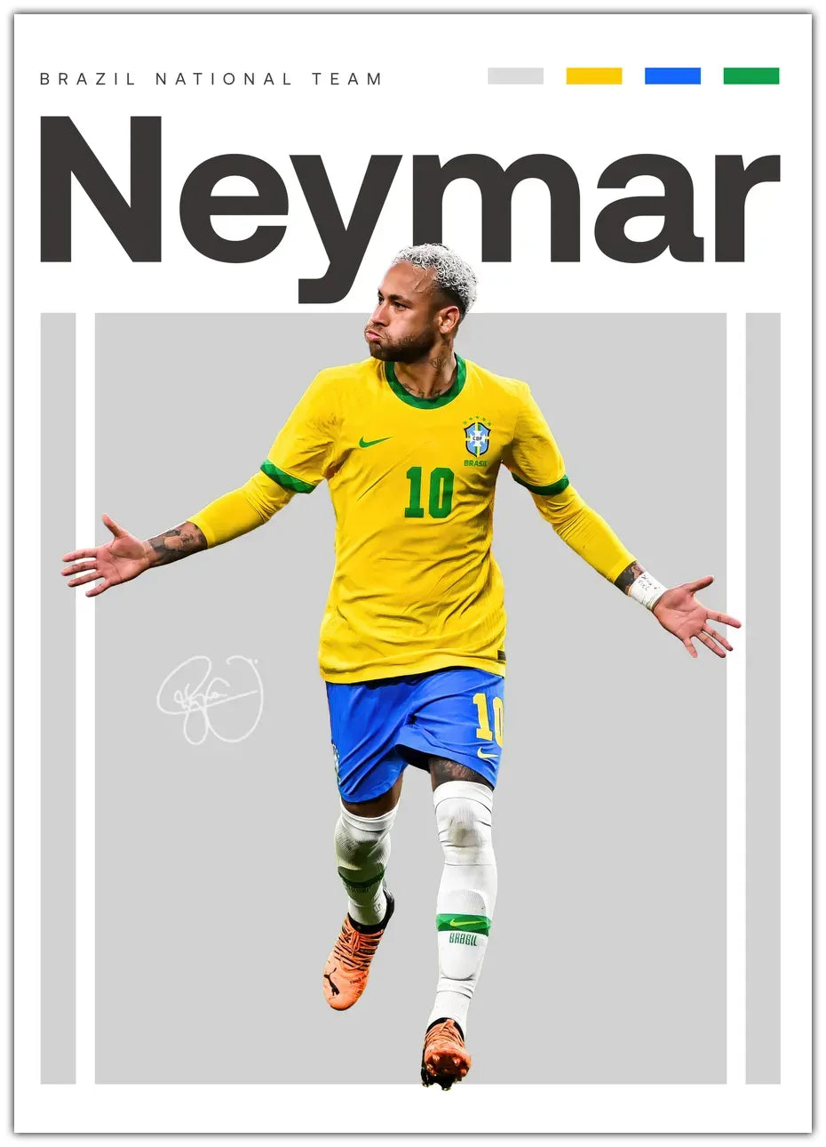 Stilfuld plakat af Neymar i Brasiliens ikoniske gule trøje. Perfekt til enhver fan og en flot vægdekoration!