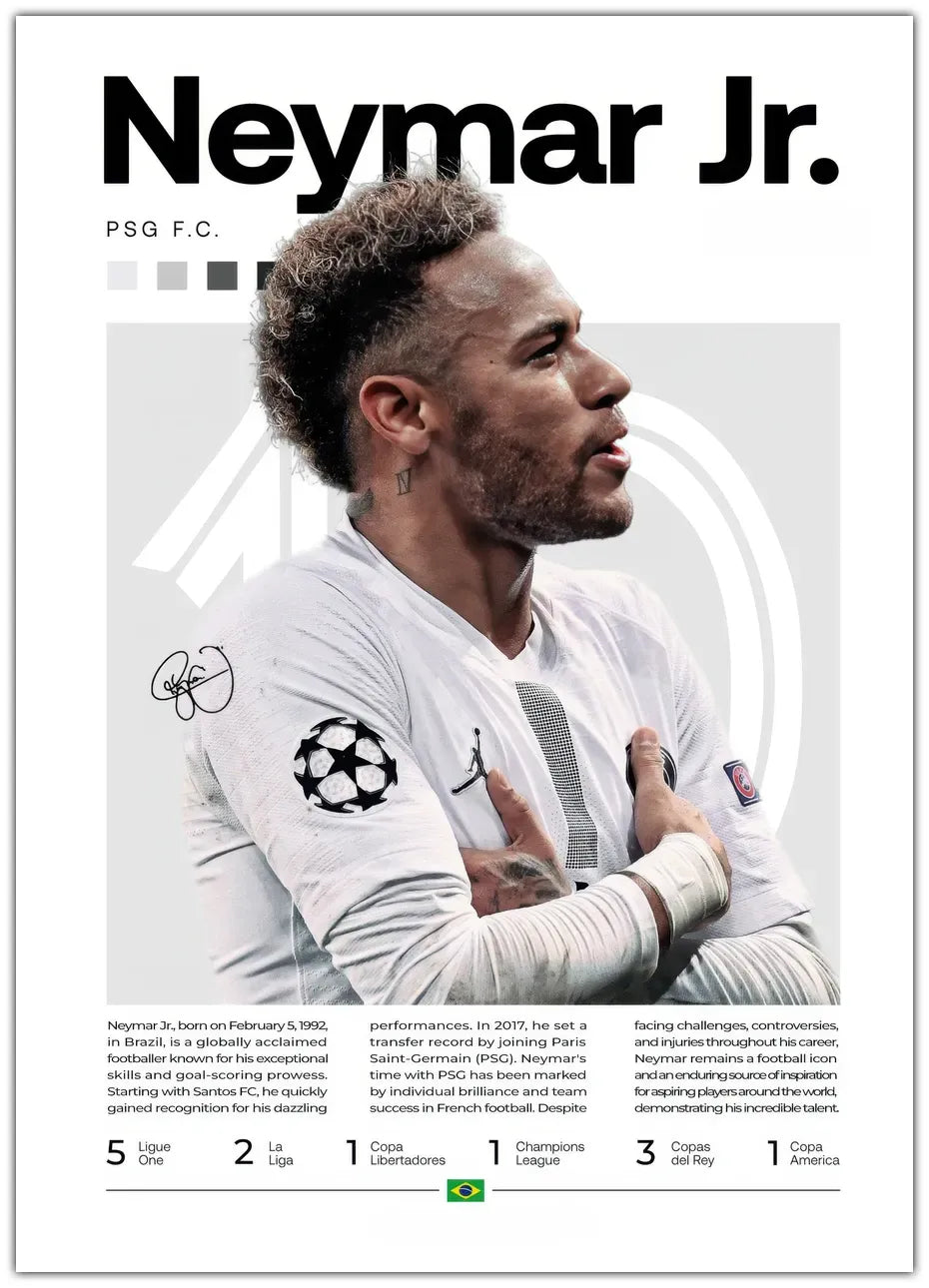 Stilfuld plakat af Neymar i Paris Saint-Germains hvide trøje. Perfekt til enhver fan og en flot vægdekoration!