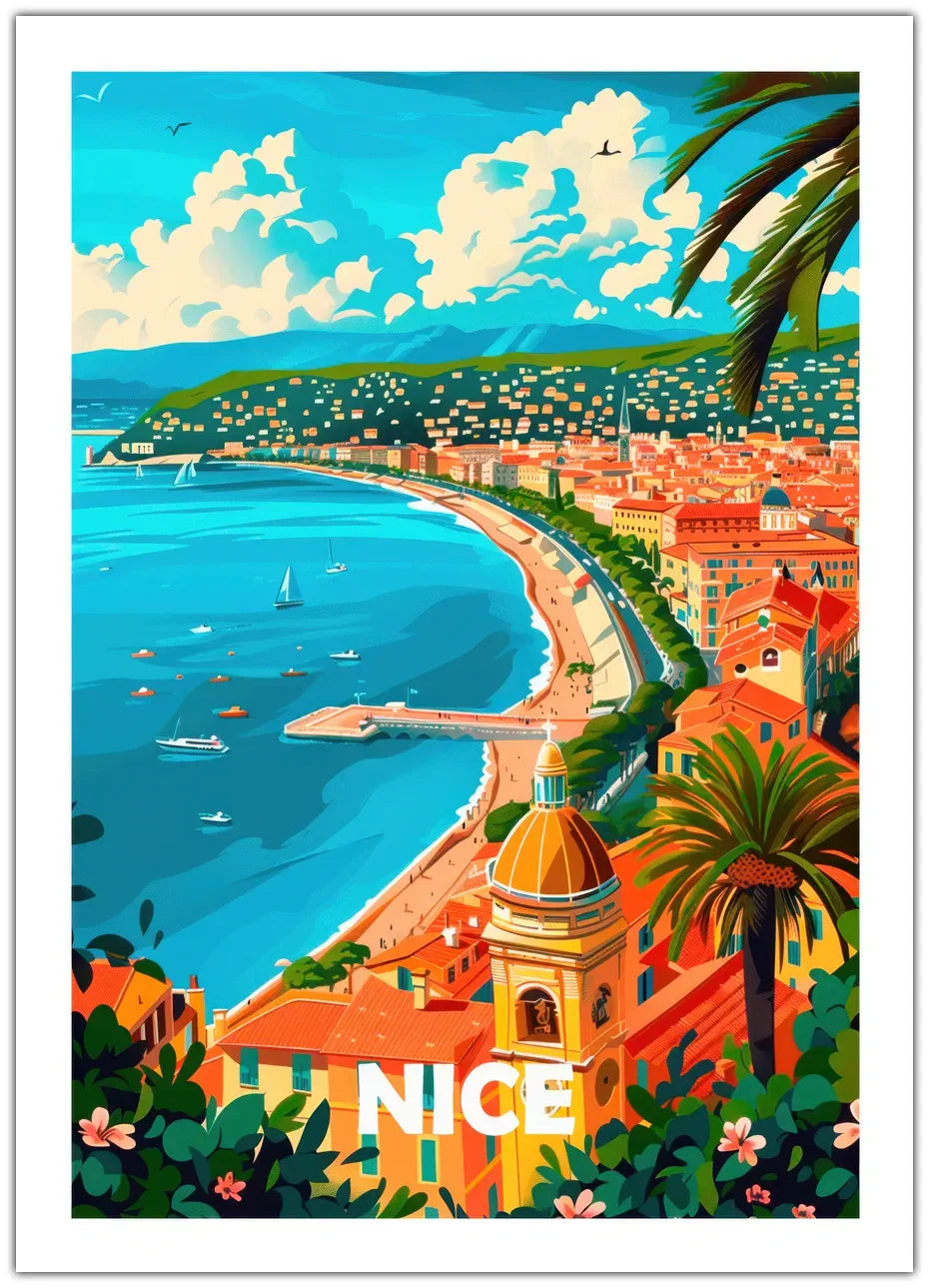 Indfang Nice's fortryllende atmosfære med vores billedskønne plakat, der fremhæver byens solbeskinnede strande, farverige arkitektur og charmerende middelhavsstemning. En strålende hyldest til den franske rivieras skønhed og elegance, perfekt til enhver væg.