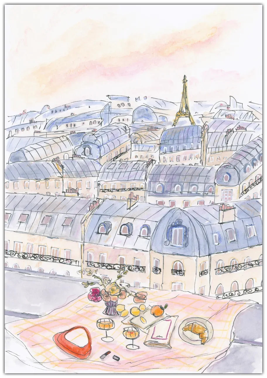 Parisian Rooftop Plakaten fanger den charmerende atmosfære af Paris set fra en takterrasse. Med en smuk akvarelillustration, hvor Eiffeltårnet stolt tårner sig op over de parisiske tage, får du et kunstværk, der udstråler romantik og livsglæde. Plakaten er perfekt til at bringe den parisiske charme ind i dit hjem.
