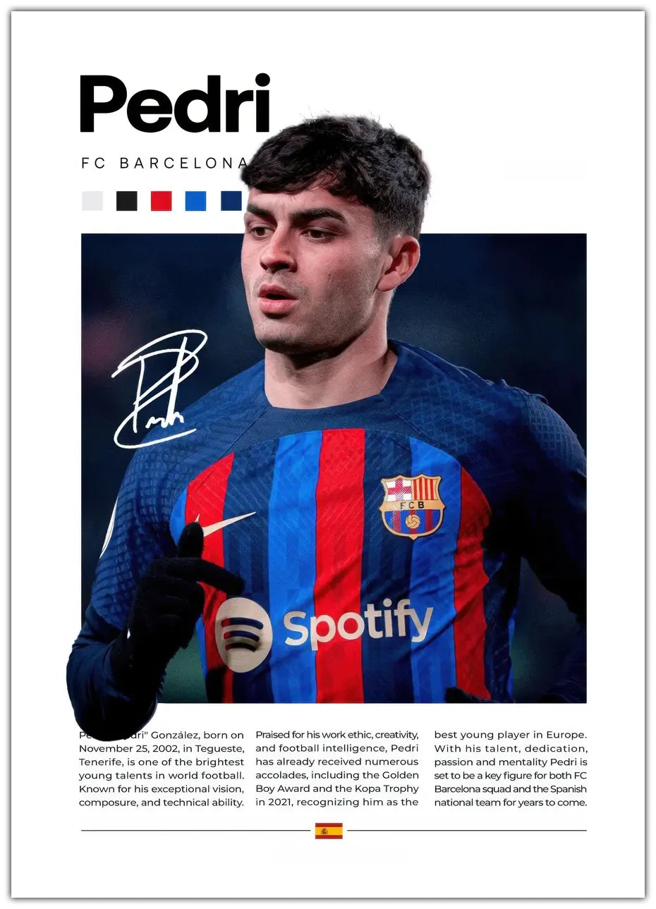 Stilfuld plakat af FC Barcelonas midtbanemagiker Pedri. Perfekt til enhver fan og en flot vægdekoration!