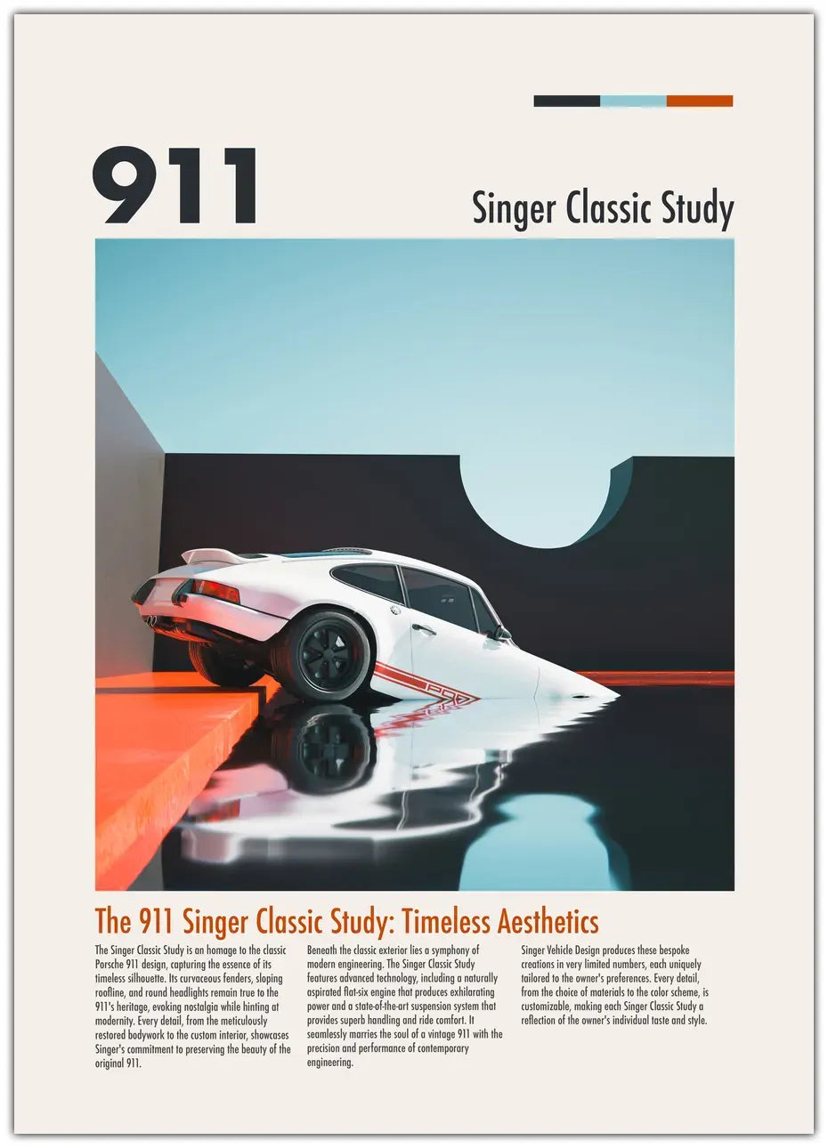Porsche 911 Singer Classic Study: Perfektion i hver detalje! Udforsk symbiosen af klassisk charme og moderne håndværk med vores plakat, der hylder den udsøgte forvandling af Porsche 911 af Singer.