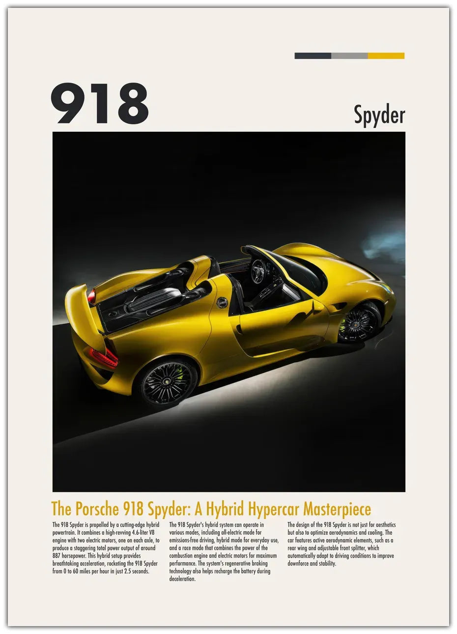 Porsche 918 Spyder: Fusion af teknologi og rå kraft! Udforsk en ny æra af superbiler med vores plakat, der hylder Porsche 918 Spyders revolutionerende design og utrolige ydeevne.