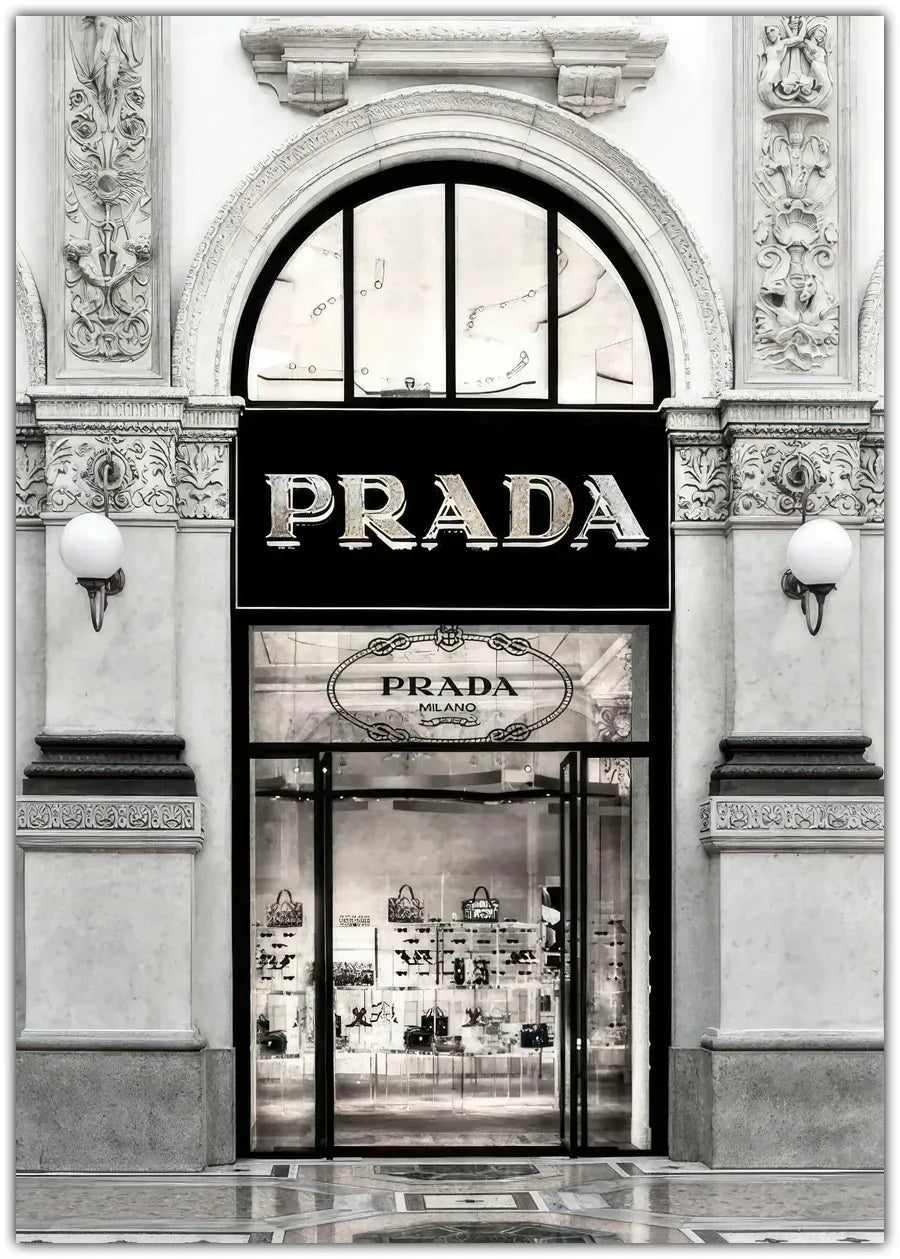 Skab en atmosfære af mode og elegance med vores "Prada Boutique Front" plakat. Et imponerende og ikonisk billede af butikkens facade, der fanger Prada's luksuriøse æstetik og tiltaler enhver modeentusiast. Tilføj et strejf af raffinement til dit rum med dette stilsikre design.