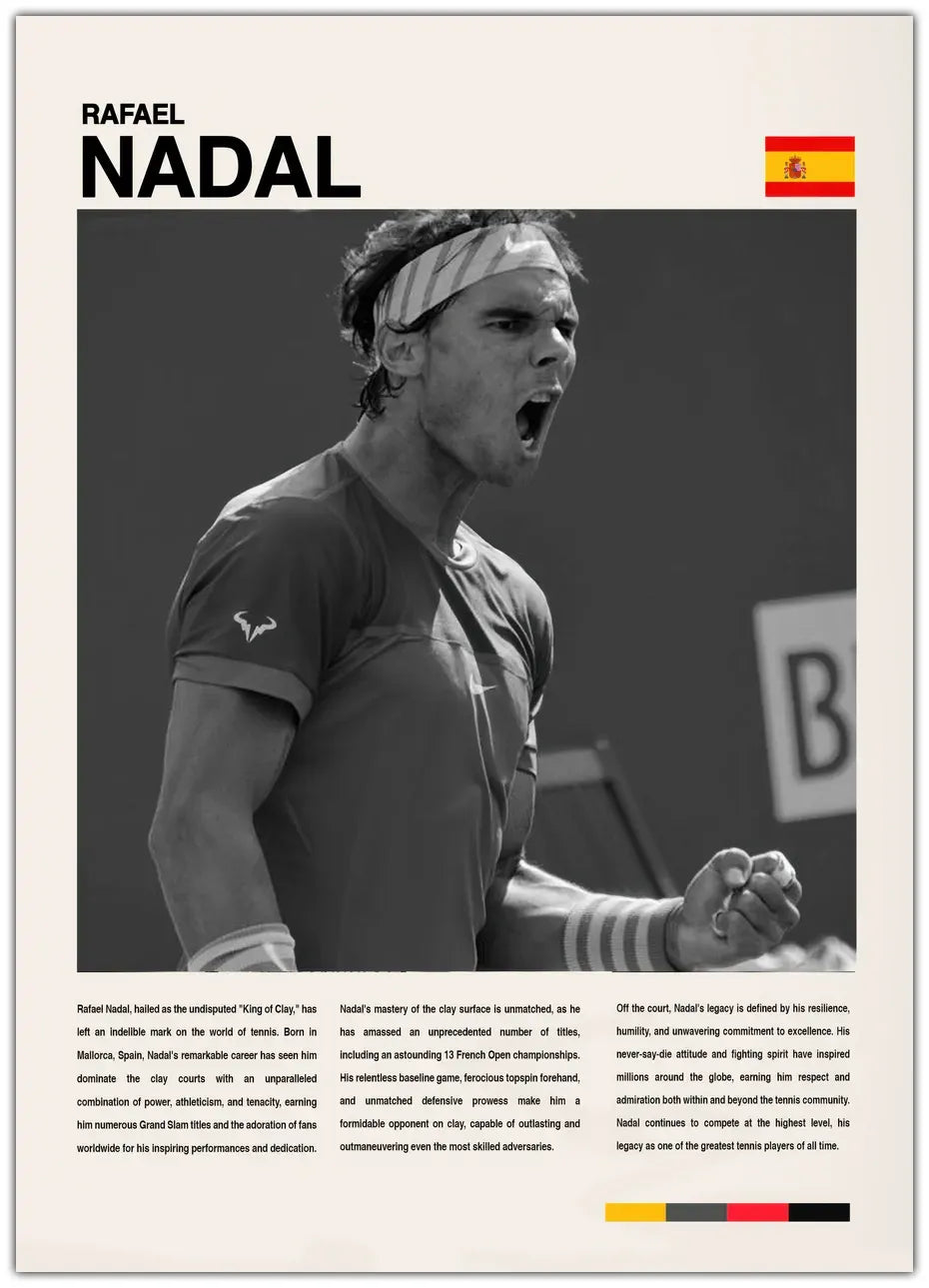 "Nadal: En ikonisk plakat, der indfanger Rafael Nadals utrolige tennisspil og sejre på banen. Perfekt til enhver fan af sporten, denne plakat hylder en af tennisens største mestre. Licens: CC BY 4.0."