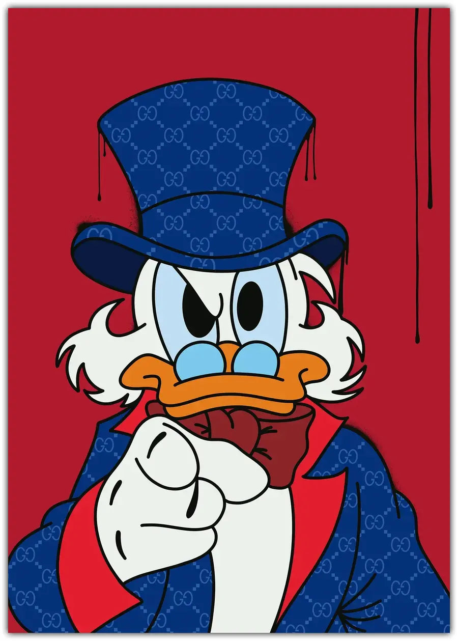 Scrooge McDuck x Gucci plakaten kombinerer street art med luksusmode i et farverigt og iøjnefaldende design. Den ikoniske figur står i sit klassiske outfit med et eksklusivt twist – her iført et mønster inspireret af Gucci, der giver motivet en moderne og eksklusiv vibe.