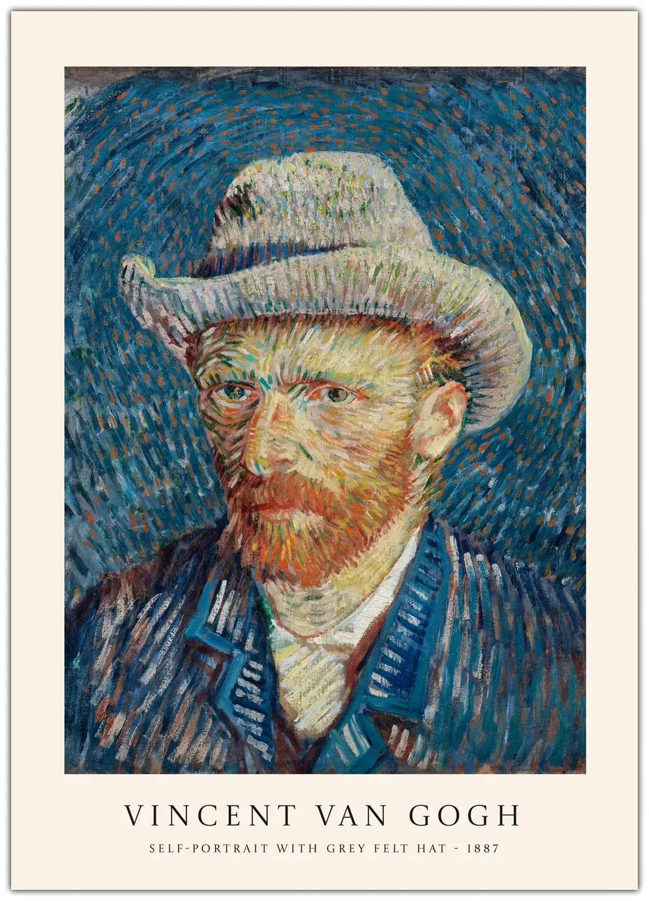 "Self Portrait With Grey Felt Hat": En imponerende plakat, der viser Van Goghs selvportræt med en grå filt hat, med dybde og karakter i hans udtryksfulde ansigtstræk, hvilket afspejler kunstnerens introspektion og passion for portrætmaleri.