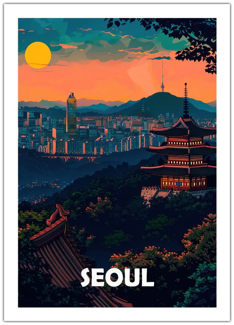 Seoul plakaten fanger den sydkoreanske hovedstads magiske stemning ved solnedgang. De varme orange nuancer smelter sammen med byens lys og den klassiske pagode i forgrunden, hvilket skaber et fantastisk spil mellem tradition og modernitet.