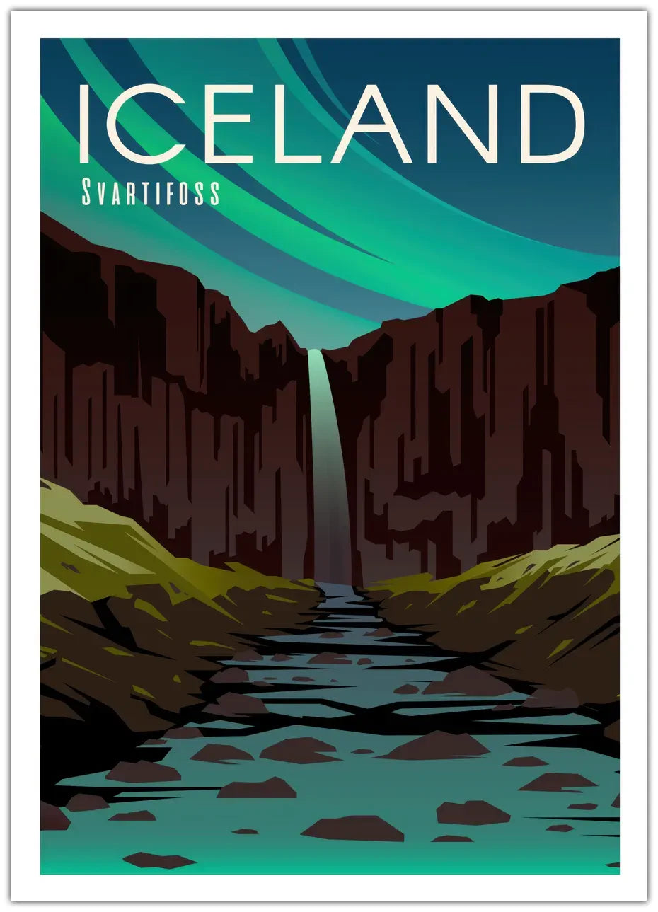 Oplev Islands dramatiske natur med vores "Svartifoss" plakat. Denne imponerende illustration fanger de unikke basaltklipper og det majestætiske vandfald, og bringer en følelse af vild skønhed og eventyr ind i dit hjem.
