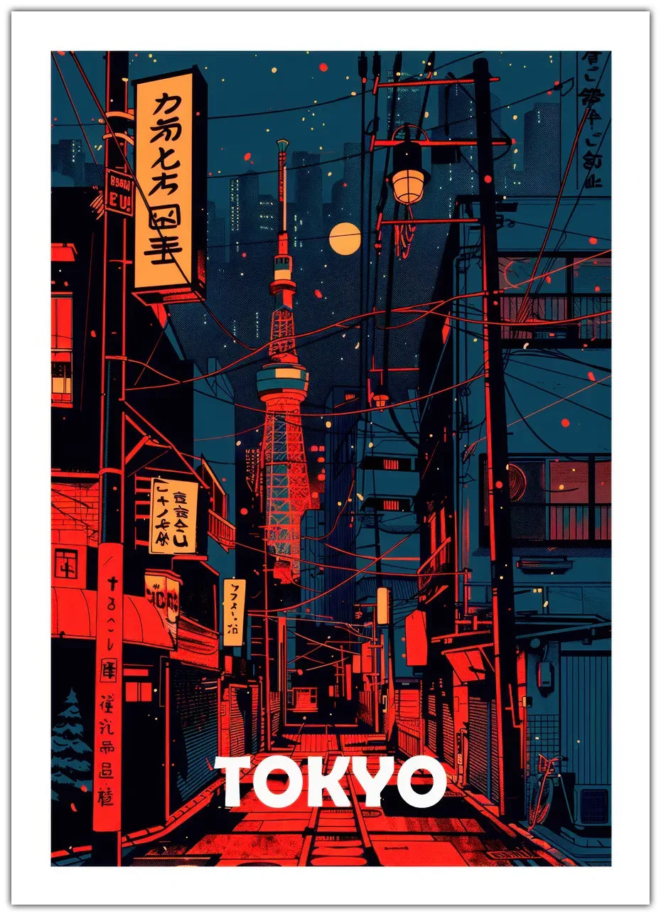 Tokyo Plakat er et visuelt stærkt og stemningsfyldt motiv, der fanger energien fra Tokyos gader på en kunstnerisk og moderne måde. De kraftige kontraster mellem varme røde toner og dybe blå nuancer giver plakaten et levende udtryk, der trækker dig direkte ind i den pulserende nat i storbyen.
