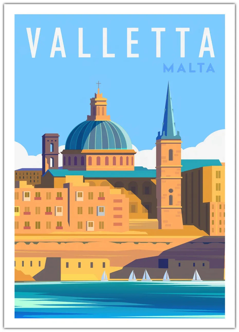 Oplev Maltas historiske hovedstad med vores "Valletta" plakat. Denne elegante illustration fanger byens barokke arkitektur og middelhavsskønhed, og bringer en følelse af kultur og historie ind i dit hjem.