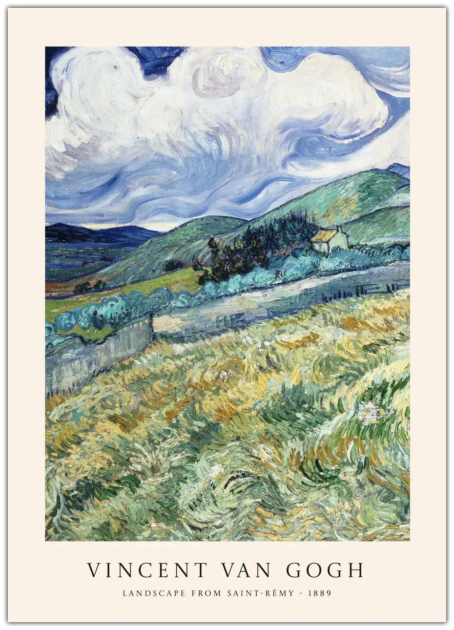 "Van Gogh - Landscape from Saint-Rémy": En smuk plakat, der viser Van Goghs enestående evne til at fange lyset og skønheden i det sydfranske landskab, med rige farver og dynamiske penselstrøg, der giver et indblik i kunstnerens sjæl og passion.