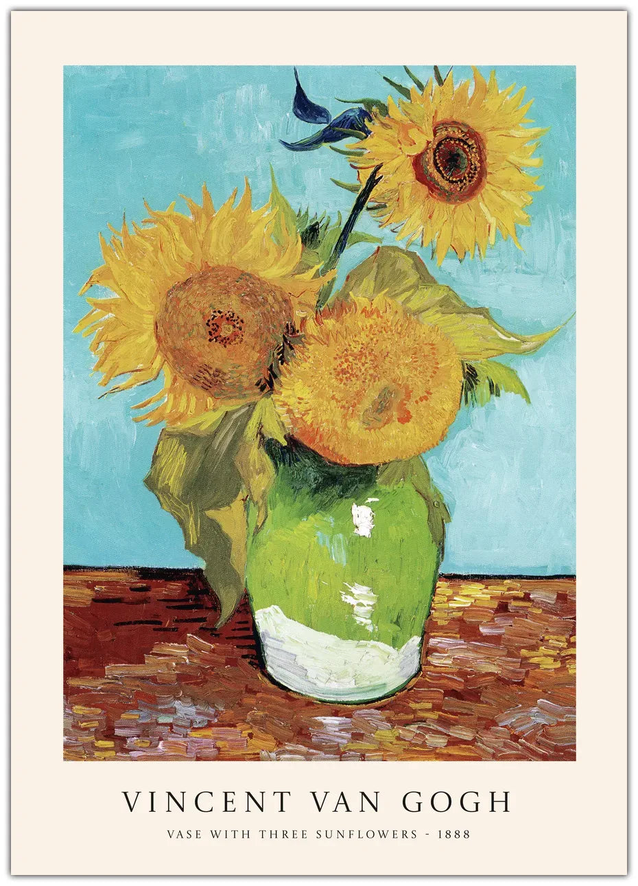 "Van Gogh - Vase With Three Sunflowers": En stemningsfuld plakat, der fremhæver Van Goghs mesterværk med sine levende solsikker og intense farver, hvilket giver et indblik i kunstnerens fascination af naturens skønhed og lys.