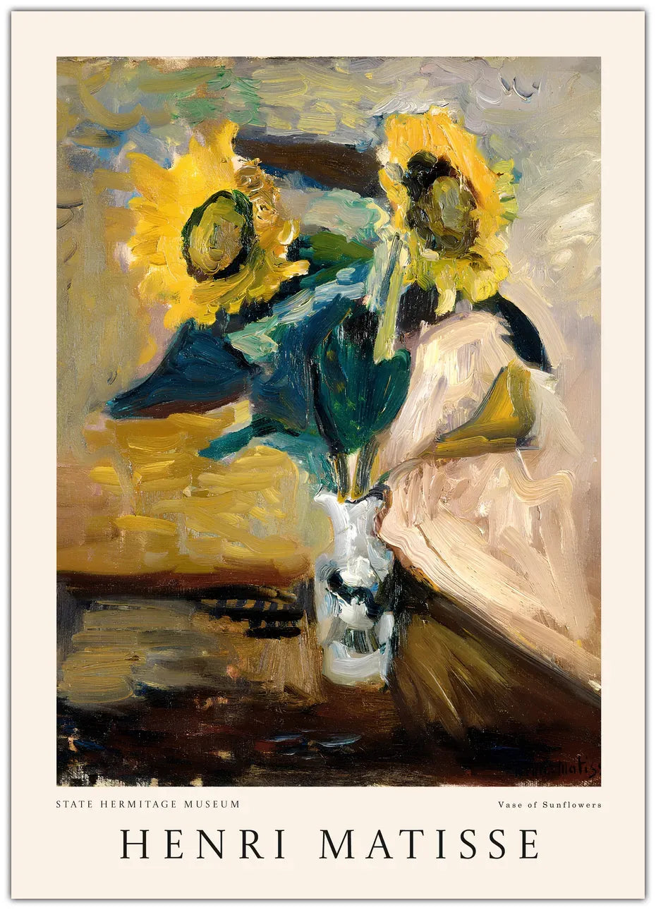 "Vase Of Sunflowers": En smuk plakat, der viser et af Matisse's malerier, med en strålende vase fyldt med solsikker, der fanger lysets glæde og naturens skønhed i dette livlige motiv.
